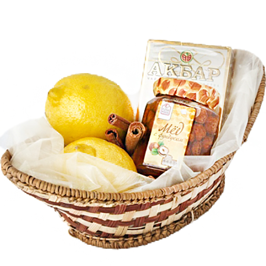 Состав: чай, 2 лимона, мед, палочки корицы, корзинка лодочка.
